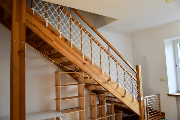 Całe wnętrze uzupełniane jest dodatkami z białego sznurka, nie było więc tajemnicą, czego użyję do tego projektu. Zadanie jest proste: wyeliminować odstępy pomiędzy szczeblami tak, by małe dziecko bez obaw mogło się poruszać po schodach.